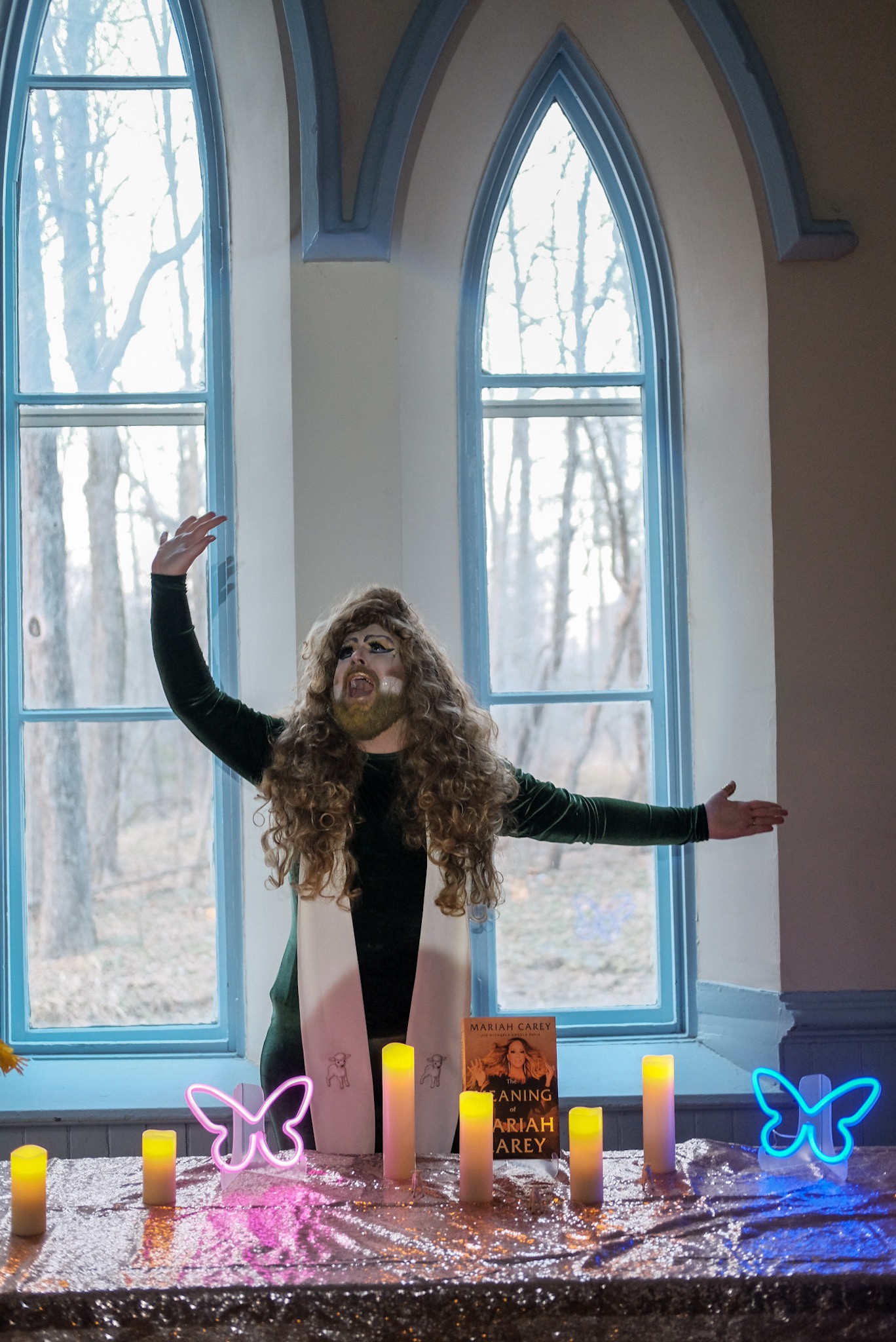 Little Lamb is a new kind of church service—one where the Songbird Supreme, global superstar, and gay icon Mariah Carey is our Lord and Savior. The performance takes inspiration from the artist’s experience: a Catholic upbringing in Boston, Massachusetts, that led to a secular search for faith in gay iconography. The artist — drag performer Melissabeth — assumes the role of the Priest, dahlings, leading the audience through selections from Mariah’s music catalog, an autobiographical sermon, and an offering of Mimi’s festive spirit through symbolic food and drink. Little Lamb asks: can the stale structures of a Catholic mass lay the foundation for something new and beautiful?